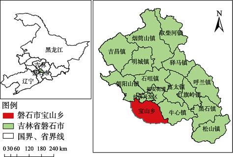 宝山乡隶属吉林省磐石市,位于东经125°53′00″-126°11′00″,北纬42°46′00″-42°56′00″。宝山乡位于磐石市西南部,东与磐石市经济技术开发区、牛心镇接壤,南与辉南县相连,西与梅河口市牛心顶子镇、兴华乡隔亮子河相望,北与朝阳山镇、福安街交界,面积241.75 km2(图1)。
