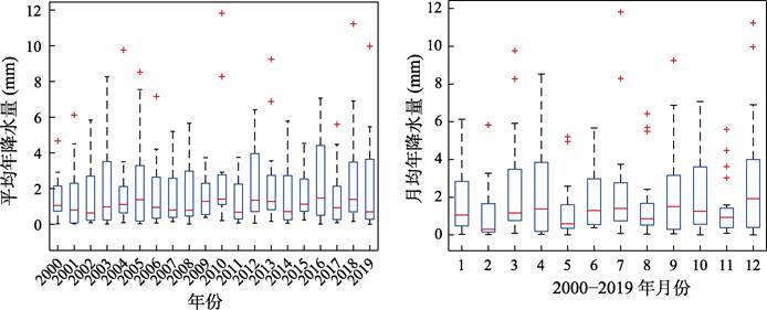图10 2000-2019年磐石年平均降水量、月平均降水量统计图