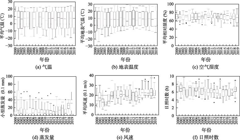 图11 2000-2019年磐石平均气温、地表气温、相对湿度、蒸发量、风速、日照时数统计图