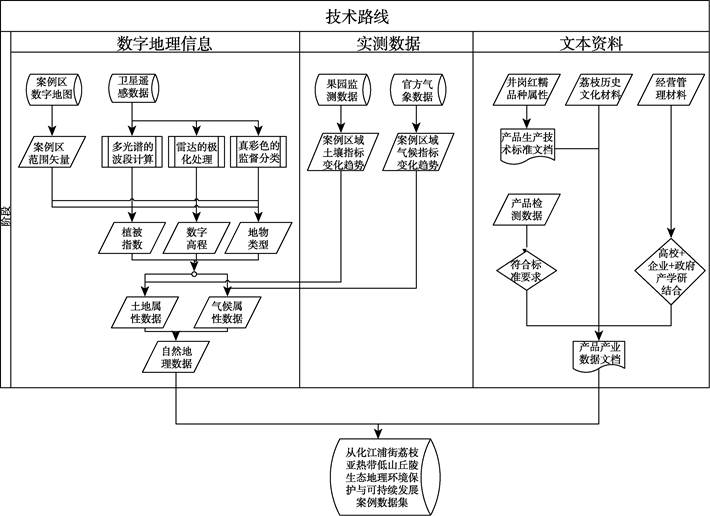 本案例数据一方面从已有地图数据、遥感影像数据、官方统计数据、实测数据等数据出发,基于对案例产品井岗红糯荔枝生长发育过程中对生态环境要求的分析,获取案例区域自然地理环境优势、农业产业发展特征。另一方面聚焦案例产品自身品质和品牌把关,讨论从化江埔荔博园生产经营管模式先行案例的有效贡献。数据集研发技术路线如图1所示,主要数据如下。