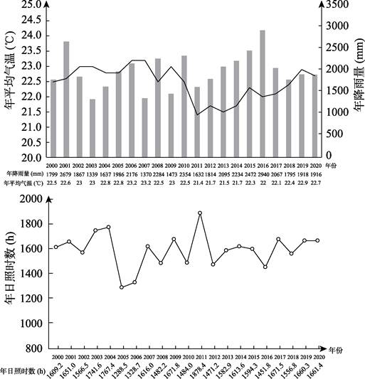 属于中亚热带与南亚热带过渡区域,气候类型为亚热带季风气候。2000-2020年20年平均降水量为1,992.7 mm,年平均气温为21.5 ℃,年平均日照时间1,588.1小时(图3)。光、热、水资源丰富,适合荔枝生长发育。