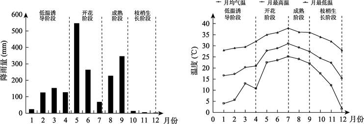 荔枝生长对环境要求苛刻,生长发育期要求高温多雨,适宜生长温度为23-29 ℃,温度在10-12 ℃时生长缓慢。冬季要有一段低温时间,以抑制枝叶生长,促进花芽分化。春季温度10 ℃以上荔枝才开始开花,温度在18-24 ℃时开花最盛,如在花期及幼果期低温阴雨,会造成大量落花落果,甚至全部失收[3]。对种植区域的降水和气温进行逐月、日的长时续监测对荔枝种植业的保产估产具有重要的意义。