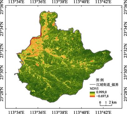 江埔街道在海拔0-100 m以内的荔枝宜植区域面积为78.35 km2(图8),占区域面积的60%,通过江埔街道土地利用分类图数据[5]计算区域内的建成地用地面积为21.58 km2(图9),江埔街道荔枝种植适宜面积为55 km2左右,计算其他土地利用途径后与监督分类数据44.63 km2吻合。此外我们通过Sentinel-2 L2A数据计算了江埔街道的归一化植被指数(NDVI)的分布图(图10),通过计算,江埔街道的NDVI 均值为0.633,高于广东省总体水平0.54,这说明江埔街道区域内整体植被覆盖与多样性更好,区域内的水土稳固、生态健康,荔枝的生长发育拥有更好的环境。